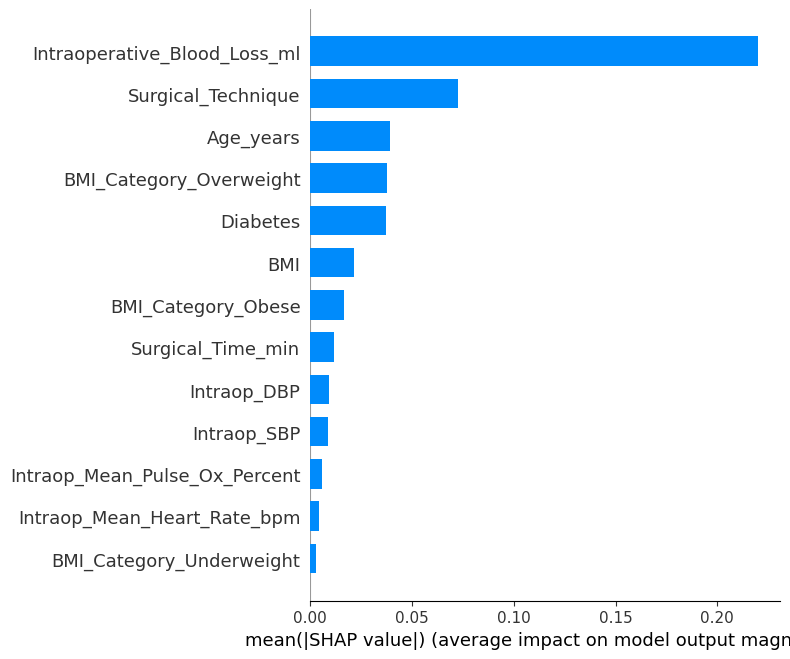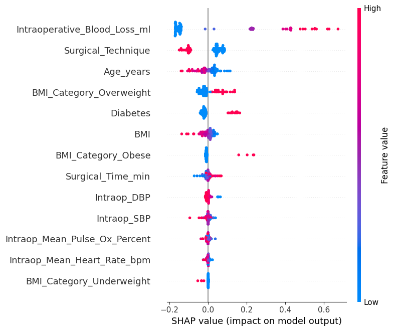 ['Age_years', 'BMI', 'Surgical_Technique', 'Intraoperative_Blood_Loss_ml', 'Intraop_Mean_Heart_Rate_bpm', 'Intraop_Mean_Pulse_Ox_Percent', 'Surgical_Time_min', 'BMI_Category_Obese', 'BMI_Category_Overweight', 'BMI_Category_Underweight', 'Intraop_SBP', 'Intraop_DBP', 'Diabetes']